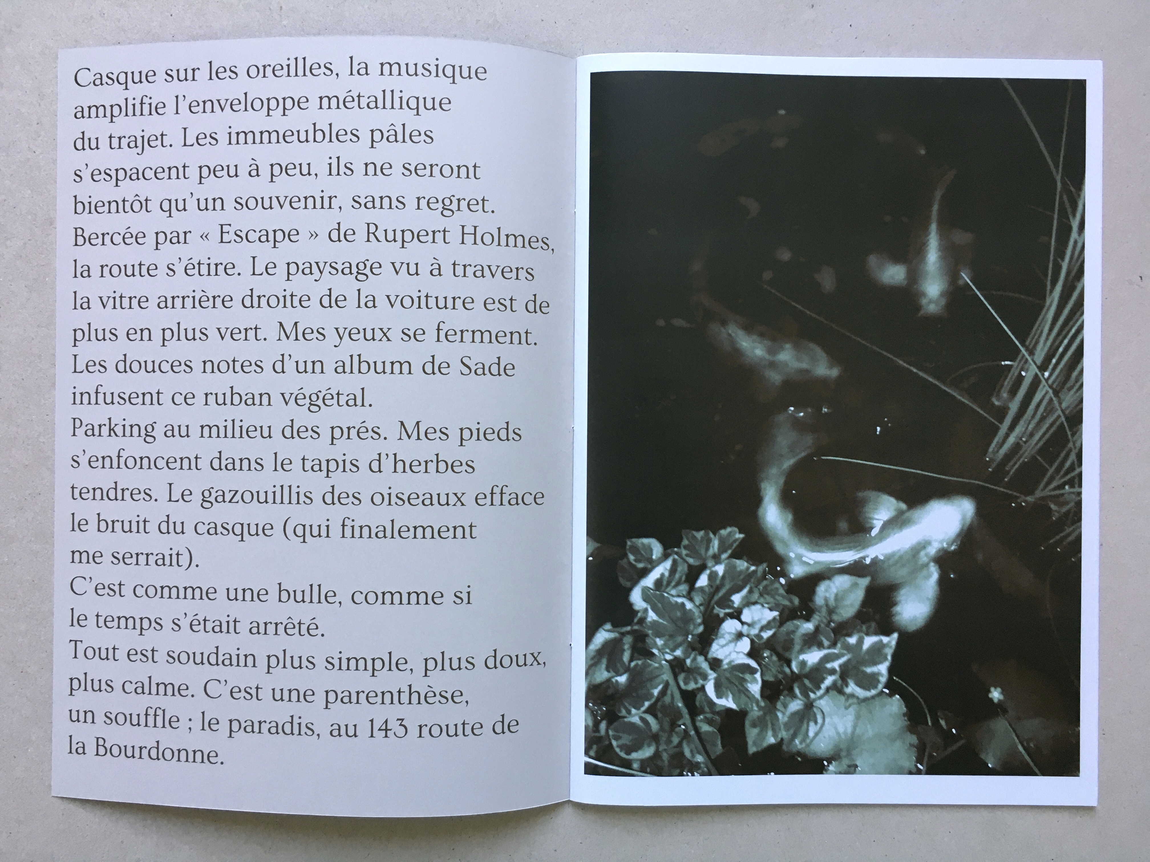 Casque sur les oreilles, la musique amplifie l’enveloppe métallique du trajet. Les immeubles pâles s’espacent peu à peu, ils ne seront bientôt qu’un souvenir, sans regret. Bercée par « Escape » de Rupert Holmes, la route s’étire. Le paysage vu à travers la vitre arrière droite de la voiture est de plus en plus vert. Mes yeux se ferment. Les douces notes d’un album de Sade infusent ce ruban végétal.